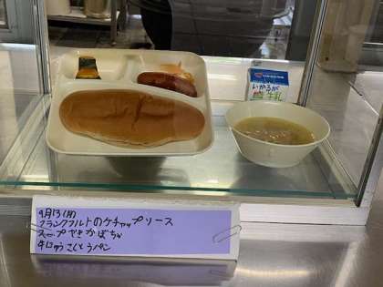 フランクフルトのケチャップソース、スープ、焼きカボチャ、黒糖パン、牛乳