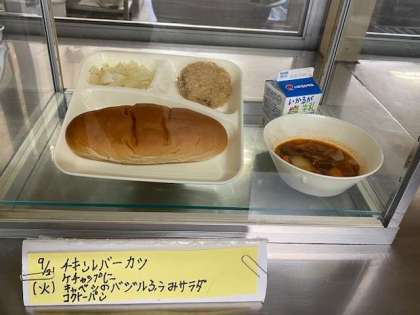 チキンレバーカツ、ケチャップ煮、キャベツのバジル風味サラダ、黒糖パン、牛乳