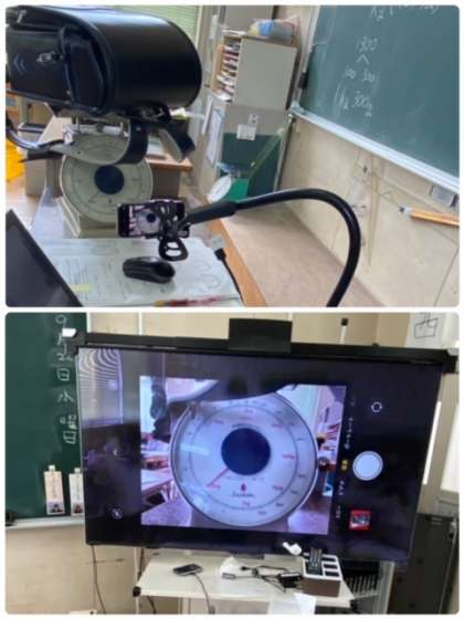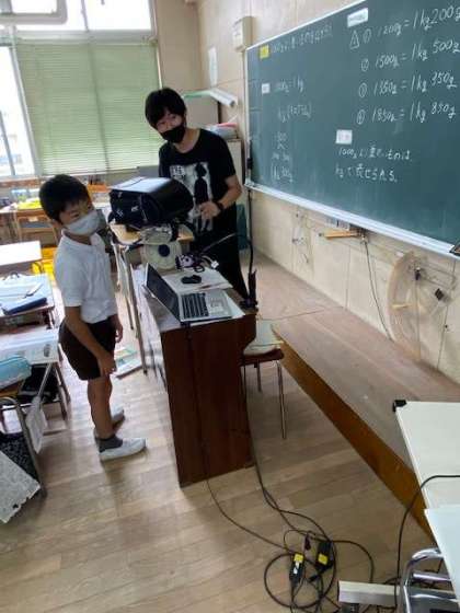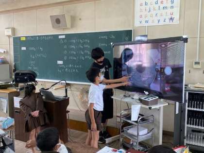重さの学習をしています。はかりを使って、Kgの学習をしています。写真は、ちょうど空っぽのランドセルの重さをはかっているところです。大型モニターにはかりのメモリを写して全員で確かめていました。