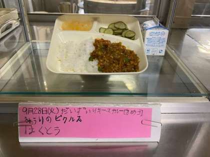 大豆入りキーマカレーライス(米粉)、きゅうりのピクルス、白桃(カット缶)、牛乳