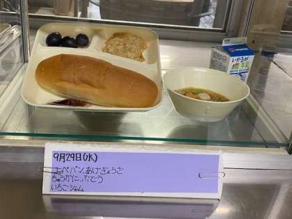 揚げ餃子、中華煮、ブドウ(巨峰)、いちごジャム、コッペパン、牛乳