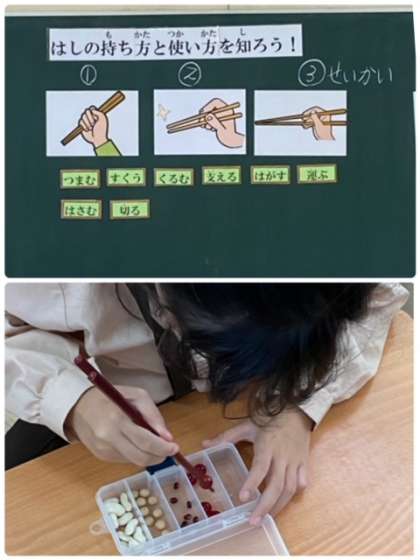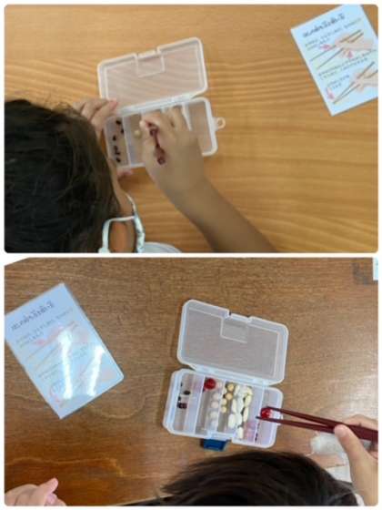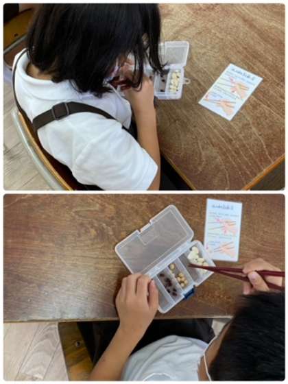 1年生が、食育として、お箸の持ち方と使い方を学習していました。実際に豆やビー玉をケースの違う場所に移し替える作業にチャレンジしていました。