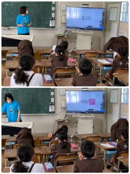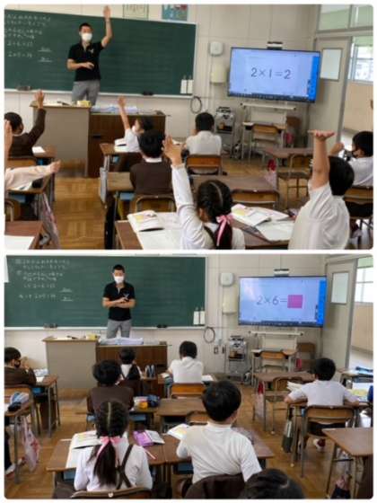 ?九九の学習をしています。今日は2の段について、大型モニターにうつしながら、みんなで復唱していました。声に出して、九九を覚えています。