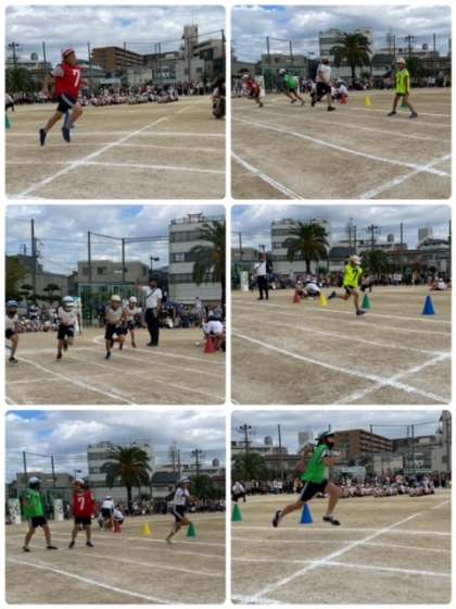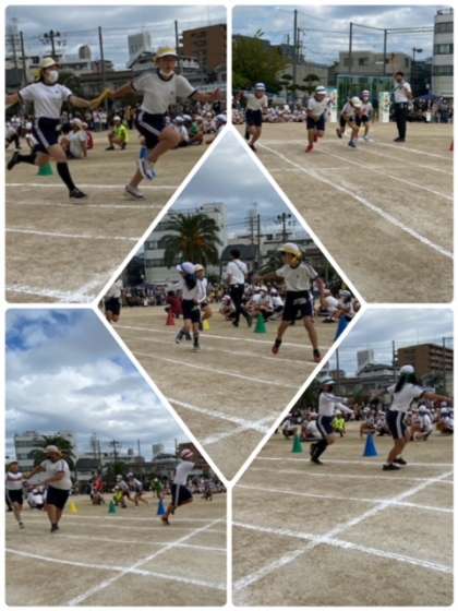 5年生のリレー。一人一周走ります。バトンパスもスムーズです。見応えのあるリレーです。