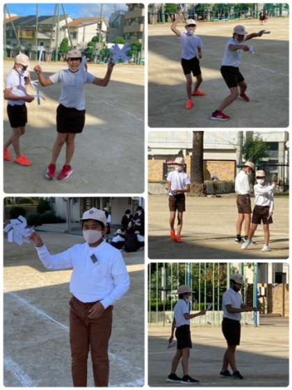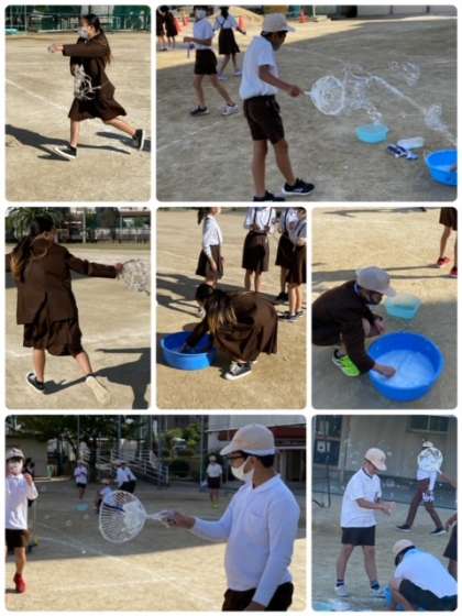 遊んでいるように見えるかもしれませんが、この時間は、探究の時間です。ブーメランとシャボン玉について、仲間と相談しながら、試行錯誤しながら、試しています。