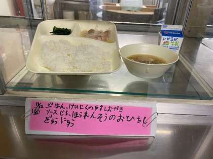 鶏肉の柚子塩焼き、ソーキ汁、ほうれん草のおひたし、ご飯、牛乳