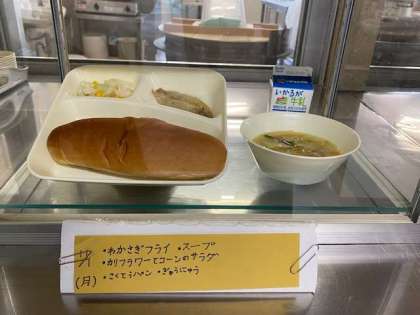ワカサギフライ、スープ、カリフラワーとコーンのサラダ、黒糖パン、牛乳