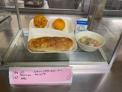 豚肉と野菜のスープ煮、かわりピザ、みかん、おさつパン、牛乳