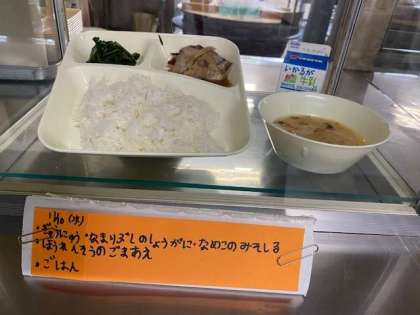 なまりぶしの生姜煮、なめこの味噌汁、ほうれん草の胡麻和え、ご飯、牛乳