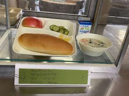 キノコのクリームシチュー、きゅうりのバジル風味サラダ、りんご、大型コッペパン、マーマレード、牛乳