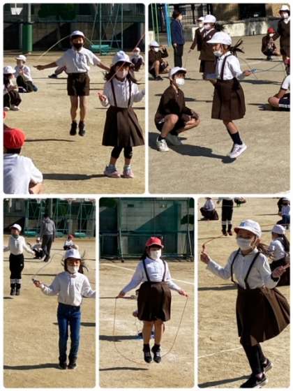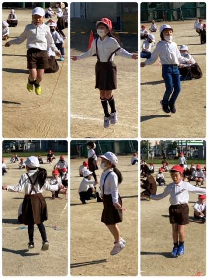 次は、1、2年生です。1年生の回数は6年生が数えています。前回し跳びの連続回数で記録をとりました。みんなよく頑張りました。