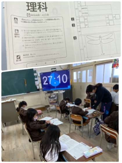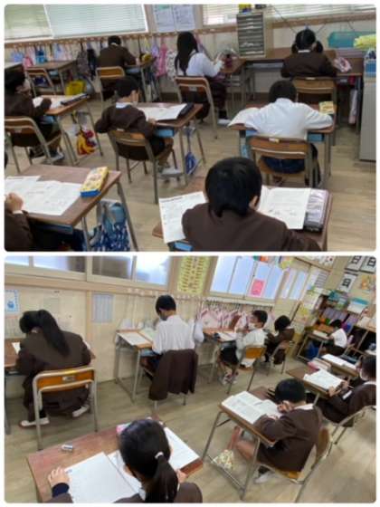 今年初めて受ける3年生が、その対策として、冊子になっている問題を見ながら、別の回答用紙に答えを書くという練習のため、擬似体験をしています。