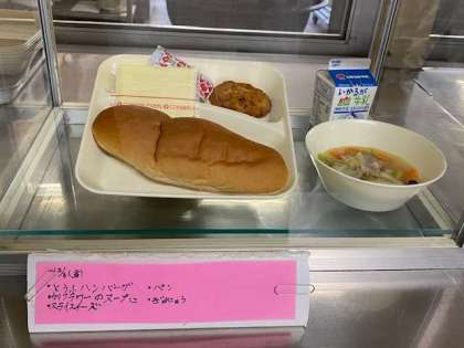 豆腐ハンバーグ、カリフラワーのスープ煮、スライスチーズ、パン、牛乳