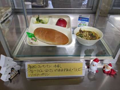 12月8日(水)の給食は、カレーうどん、白菜の甘酢あえ、りんご、コッペパン、牛乳です。