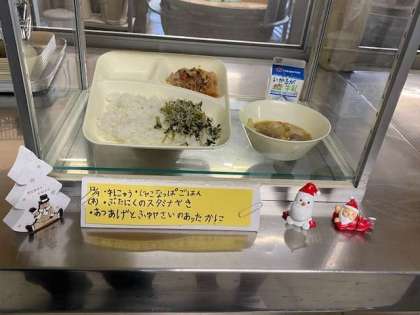 じゃこ菜っぱご飯、豚肉のスタミナ焼き、厚揚げと冬野菜のあったか煮、ご飯、牛乳