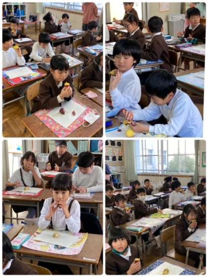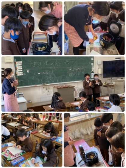 6時間目に、2年1組が、みんなで育てて収穫したおいもパーティを開きました。