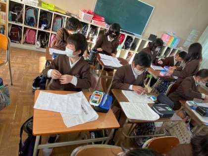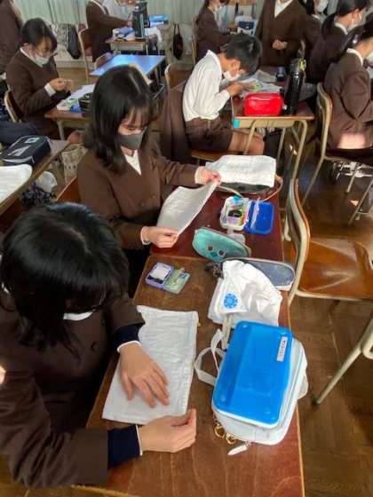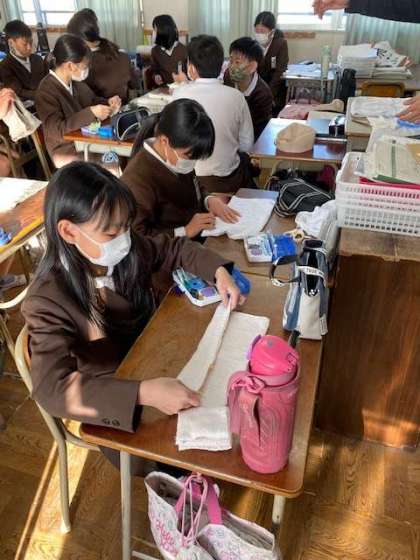 卒業を意識した学習です。在校生のために、ぞうきんを縫い始めていました。