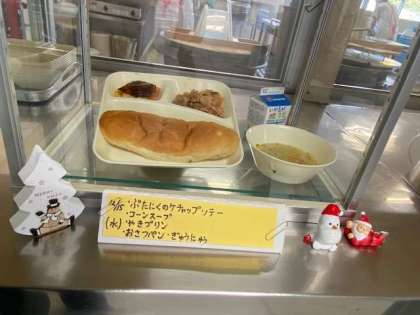 豚肉のケチャップ煮、コーンスープ、焼きプリン、おさつパン、牛乳