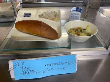 鯵のレモンマリネ、てぼ豆のスープ煮、固形チーズ、黒糖パン、牛乳