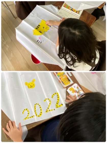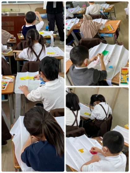 1年生が、凧作りをしていました。完成したら、運動場で、凧あげをしましょう!