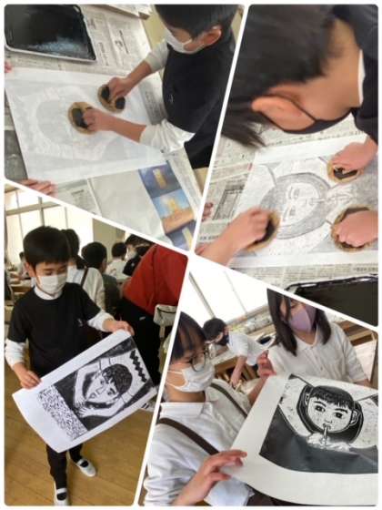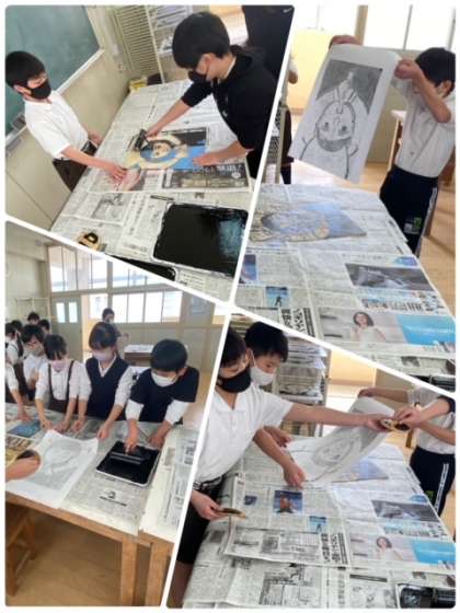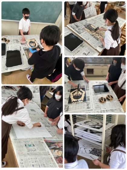 4年生が、版画をしていました。互いに協力し合って、上手に刷り上げていました。