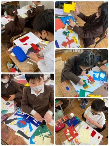 カラー紙版画に取り組んでいました。下絵を描き、そこにふさわしい色を貼って仕上げています。