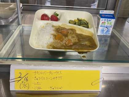 チキンレバーカレーライス、きゅうりとコーンのサラダ、いちご、牛乳