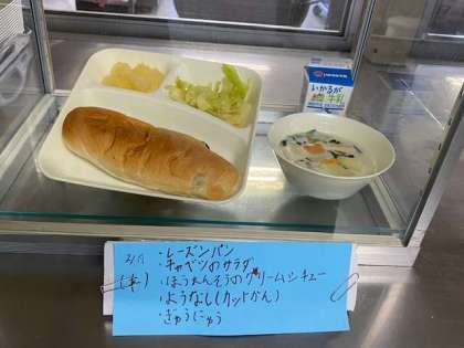 ほうれん草のクリームシチュー、キャベツのサラダ、洋梨(カット缶)、レーズンパン、牛乳