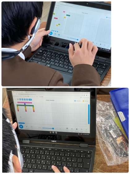旋律、リズム、楽器の音色などを工夫することで、出来上がら音楽を楽しんでいました。ヘッドフォンをしているので、教室は静かです。
