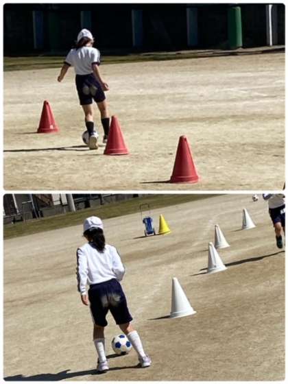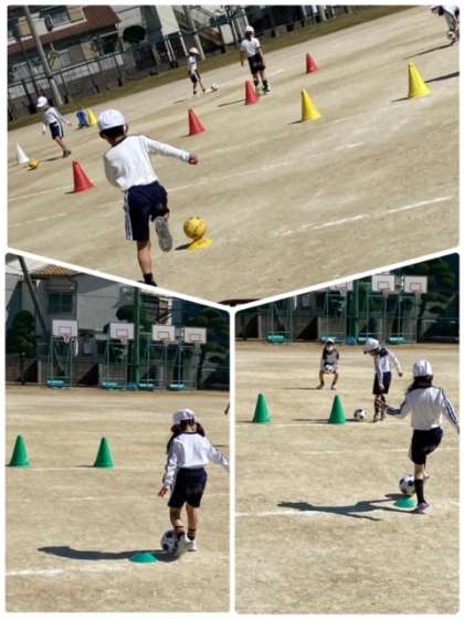 あたたかな日差しのもと、1年生が運動場で、ボール蹴り運動をしていました。ドリブルをしたり、正確にゴールを狙ったりしていました。