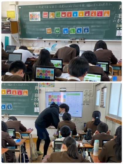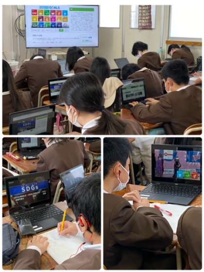 SDGsについて、自分たちで一人一台学習者用端末を活用して、ノートにまとめています。