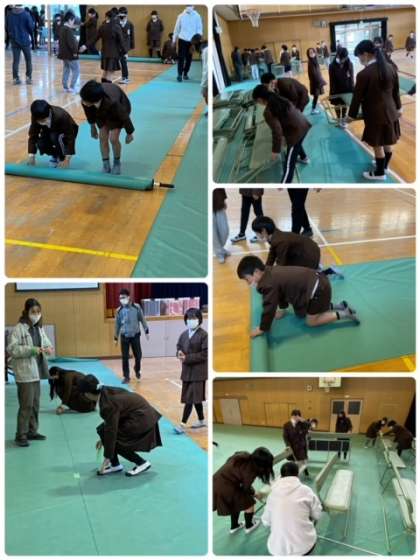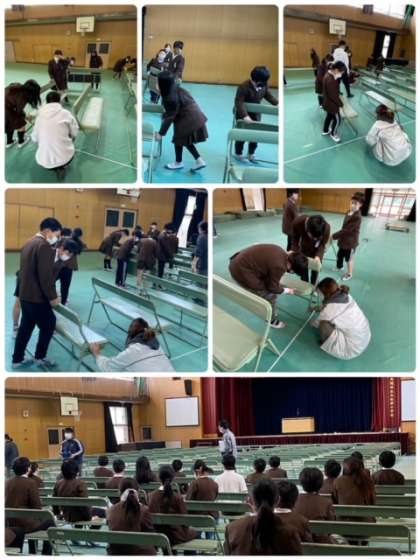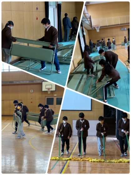 ?5年生が、講堂を卒業式の会場となるよう準備をしました。在校生として、全員が参加できない状況なので、気持ちを込めて丁寧に作業をしていました。