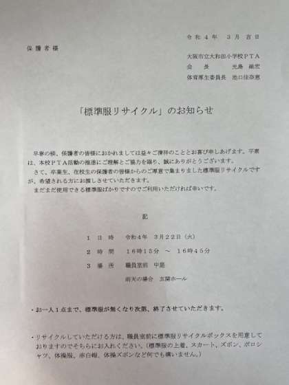 標準服リサイクルのお知らせ