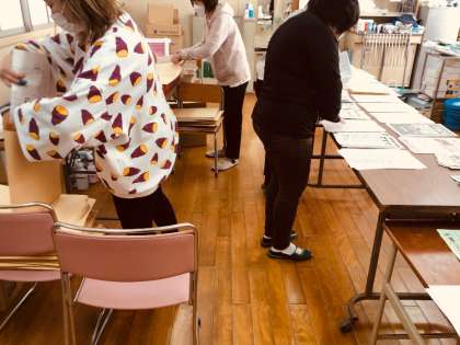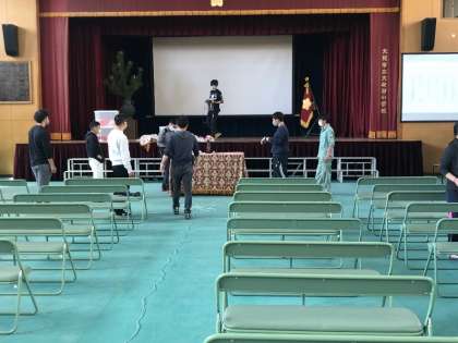 本日、教職員全員で明日の令和4年度入学式に向けて、会場の設営・1年生の教室整備・配付物の用意などの準備をしました。