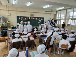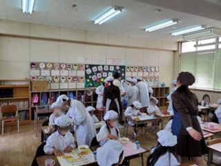 6年生が配膳などのお手伝いをしてしています。立派なお兄さん、お姉さんとしての動きをしていて、1年生も安心ですね。