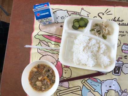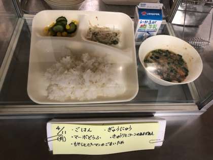 給食室には、今日の献立の盛り付け見本が置かれてあります。子どもたちはナフキンを敷いていて、その上に配膳されていきます。