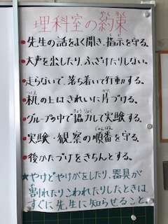 理科室での学習が始まりました。理科室の約束も掲示されています。