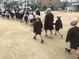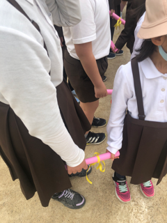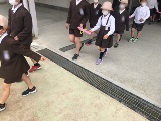 今日の1時間目に「1年生をむかえる会」をしました。6年生が1年生の手を引いて入場します。コロナ対策として、バトンを使って手をつないでいます。