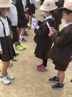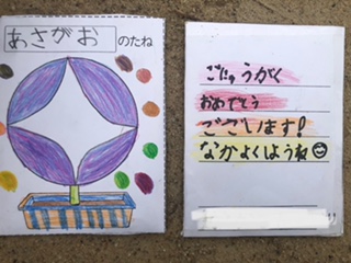 2年生が昨年育てたあさがおの種が、1年生にプレゼントされました。もらった1年生は、すぐにでも中を見たそうですね。
