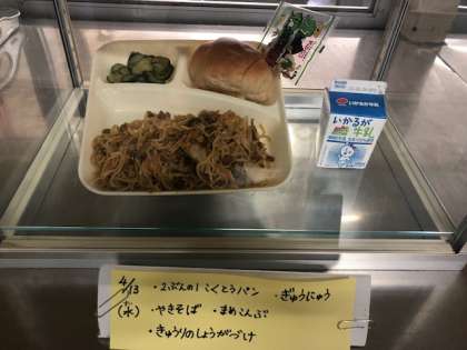 今日の給食は、やきそばでした。豆こんぶもつきました。