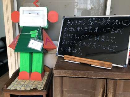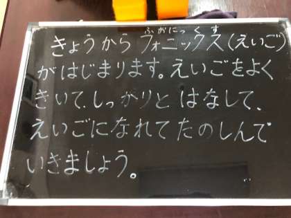校長室前には、児童には向けた今日の行事などをブラックボードに書いて置いています。今日は、フォニックス(朝の英語学習)について書かれています。