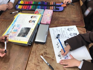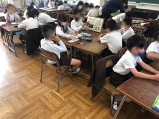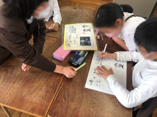 1年生を案内する準備をしています。校長室や保健室、給食室や事務室などいろいろな部屋について説明と絵をかいています。グループで相談して楽しく活動しています。