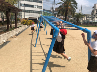 休み時間の様子もご覧ください。芝生は気持ちよさそうですね。雲梯(うんてい)にはいつも誰かが遊んでいます。