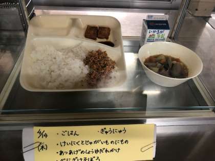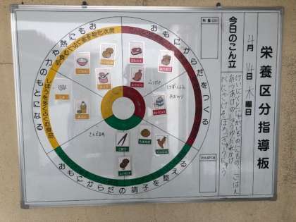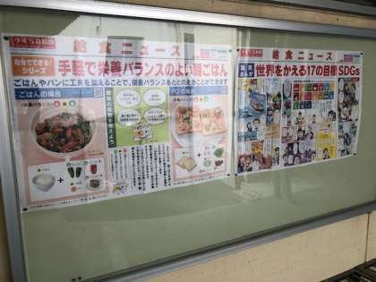 今日の給食は、和食メニューです。給食室の壁には給食についての掲示があります。