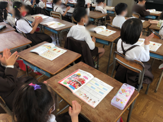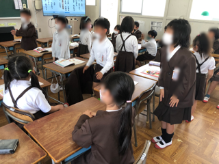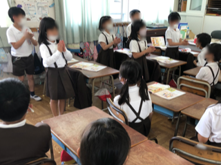 かかっている曲のリズムに乗って手拍子をしています。足を曲げたりひざをたたいたりしています。
