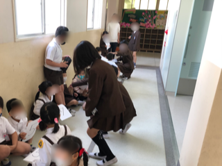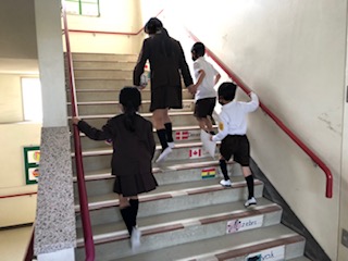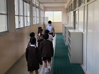 高学年(多くは6年生)が1年生を迎えにいき、いっしょに自分たちの地区の部屋にいきます。