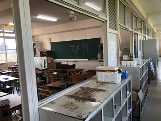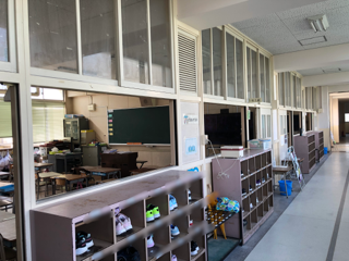 本日の学習参観では、教室内での密な状態となることを避けるため、廊下からも参観しやすいように教室の窓を外しています。