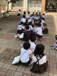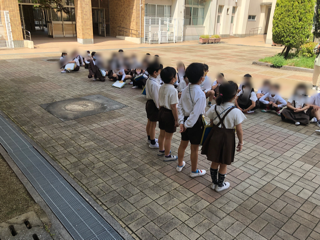 今日は、学校たんけんです。1年生と2年生が集まって、いよいよ出発です。今日は2年生が1年生をリードしていきます。2年生のお姉さん、お兄さん、がんばってね。
