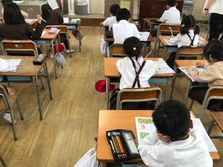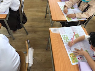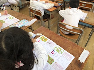 1年生が給食後の5時間目も学習に取り組んでいます。今日は「3」について学びました。
