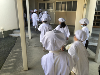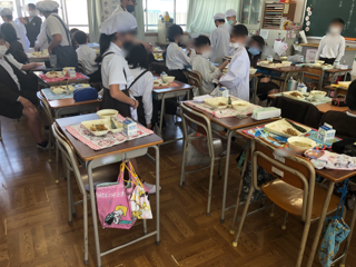 (下の写真 6年生)給食当番の子どもたちが配膳をしています。